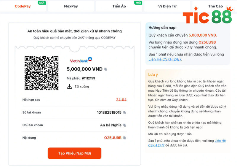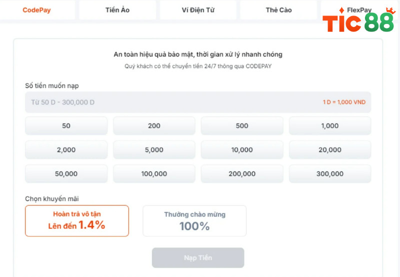 Truy cập vào tài khoản của bạn trên nền tảng TIC88, sau đó nhấp tiếp mục Nạp tiền. Tại đây, bạn sẽ thấy các phương thức giao dịch và chọn ra một cách chuyển tiền phù hợp với mình nhất.